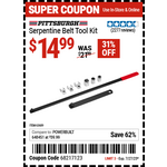 Harbor Freight has PITTSBURGH Serpentine Belt Tool Kit for $14.99 when you present coupon in store or apply code 68217123 online.