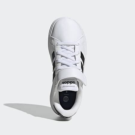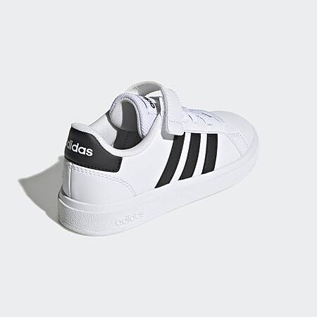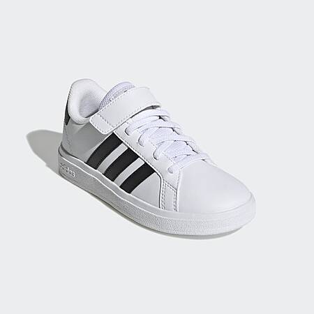 - It's never too early to build your kid's sneaker collection. Start strong with these kids' Grand Court adidas shoes. They have a sturdy yet flexible rubber cupsole that supports every step and leap. Made with elastic laces that stretch when kids pull them on and a hook-and-loop top strap they can press down themselves, these classic sneakers won't stay in the box for long.Made with a series of recycled materials, this upper features at least 50% recycled content. This product represents just one of our solutions to help end plastic waste.