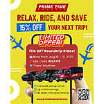 Book your Prime Time Shuttle ride for the airport, theme parks, hotels, universities or ports and save 10% using the promotional code below, all round trip rides.