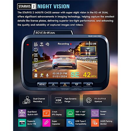 SONY STARVIS 2 SENSOR/SUPER NIGHT VISION – Equipped with a Sony IMX675 STARVIS 2 Image Sensor for the front camera, this dash cam delivers exceptional image quality with vivid colors and sharp details, even in challenging lighting conditions. Additionally, the front camera's F1.5 aperture and the rear camera's F1.8 aperture allow more light to enter the lens, resulting in brighter and clearer recordings, particularly in low-light environments.