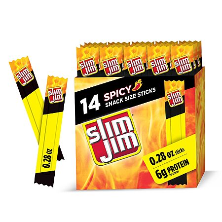 Slim Jim Smoked Meat Sticks, Spicy Flavor, 6g Protein Per Serving, Snack Size, Lunchbox Snack, 0.28 oz. (14 Count)~$3.98 @ Amazon
