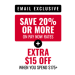 Save 20% or more on base rates when you Pay Now PLUS get an extra $15 off when you spend $175 or more on your rental with