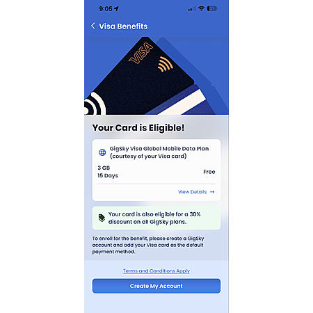 Free every 365 days with qualifying Visa card. Infinite cards get 3 Gigs of data. Signature cards get 1 Gig.