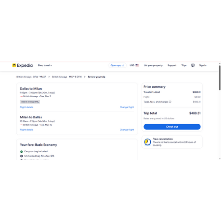 British Airways and code-sharing partners such as American Airlines via Expedia have round trip airfares travelling from Dallas (DFW) to Milan Italy (MXP) for $489, making 1 stop both ways in London. These are basic economy fares that allow a personal item and a carry-on bag. There is no seat selection and no change. If you are travelling with children, you will be seated together.