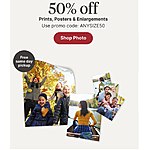 Must use code ANYSIZE50 to receive 50% off Prints, Posters & Enlargements through a logged in registered Walgreens.com/Photo online account, in store photo kiosk, or through the Walgreens Mobile App. Code must be entered at time of online, in-store photo kiosk, or mobile checkout to apply discount. Offer expires at 11:59 p.m. CT on September 27, 2025. Timing is determined by Walgreens server clock. Discount applies to all Prints including Posters and Wood Panels. Excludes instant, and prints from film. If ordering more than one item, up to three coupons or strike through sale discounts can be used in the online cart. Only one coupon code or strike through sale pricing discount can be applied per item. Account product credits are applied first and cannot be combined with coupon codes or strike through sale pricing. Void if transferred, reproduced or copied and where prohibited by law. Discount does not apply to previous purchases, taxes or shipping charges. Offer is subject to change or cancellation at any time.