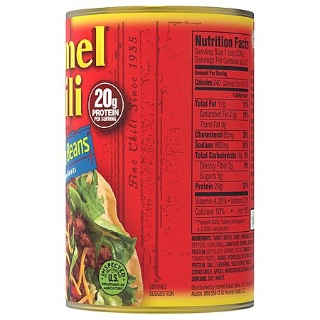 Amazon[amazon.com] has 12-Pack 15-Oz Hormel Chili Turkey No Beans for $17.76 - 5% when you check out via Subscribe & Save = $16.87. Shipping is free with Prime or on $35+ orders.