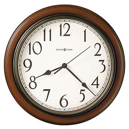 This Kalvin Wall Clock features a medium-brown cherry finished case with the charcoal gray bezel to complement your home decor. The clock's quartz movement makes a soft ticking noise without the use of chimes for a quieter environment.