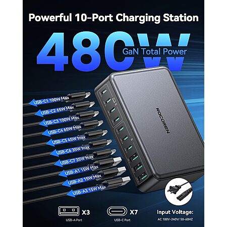 480W USB C & USB A Charger Block - 10 ports - 100W PD $49.99