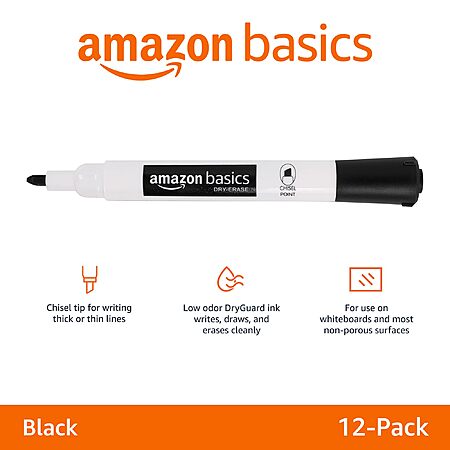 $5.58:[Prime]12-Pack Amazon Basics Low-Odor Chisel Tip Dry Erase Whiteboard Markers, Black