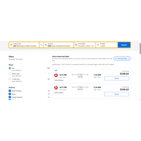 Turkish Airlines via Booking.com have round trip airfares travelling from Washington DC (IAD) to Dubai UAE (DXB) for $599, making 1 stop in Istanbul Turkey for a few hours. These are economy fares that allow a personal item, a carry-on bag and 2 free checked bags.