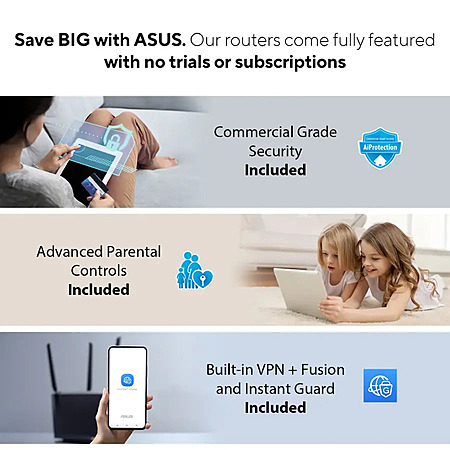 - Commercial-Grade Network Security: Lifetime free ASUS AiProtection Pro, powered by Trend Micro, with WPA3 and advanced Parental Controls to protect your home.