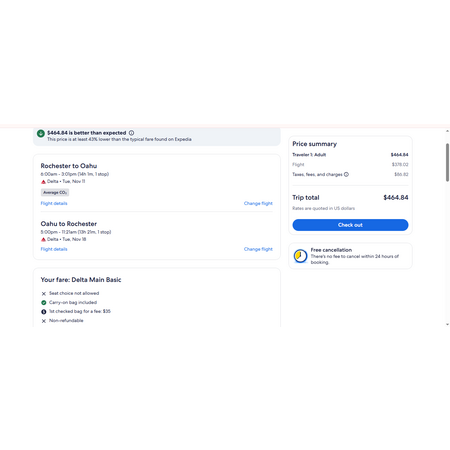 Delta and United Airlines have round trip airfares travelling to and from Buffalo (BUF) or Rochester (ROC) New York and Oahu Hawaii (HNL) for $465, making 1 stop both ways. These are basic economy fares. On Delta you may have a personal item and a carry-on bag. On United, you may only have a personal item. There are options to prepay for extra services if you choose. If you are travelling with children on United, you will be seated together as per UA's policy. Delta decides this on a case-by-case basis.