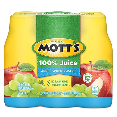 Amazon [amazon.com] has 24-Pack 8-Oz Mott's 100% Apple White Grape Juice for $9.52 - 15% when you 'clip' the coupon on product page - 5% when you check out via Subscribe & Save = $7.61. Shipping is free with Prime or on $35+