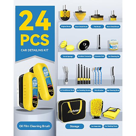 24-Piece Autown Car Detailing Brush Kit w/ Drill Brush Attachments and Oil Film Cleaning Brushes $9.99 + Free Shipping w/ Prime or on $35+