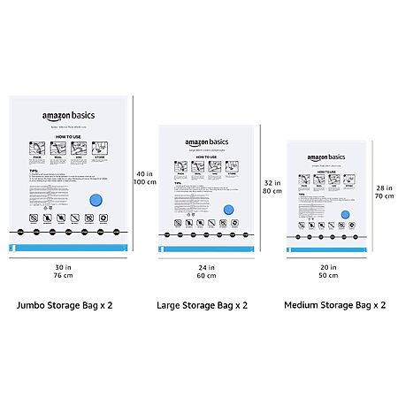 Amazon.com has Amazon Basics Multiple Vacuum Compression Zipper Storage Bags for Space Saving and Travel with Hand Pump, 6-Pack (2 Jumbo, 2 Large, 2 Medium), Transparent on sale for $12.58