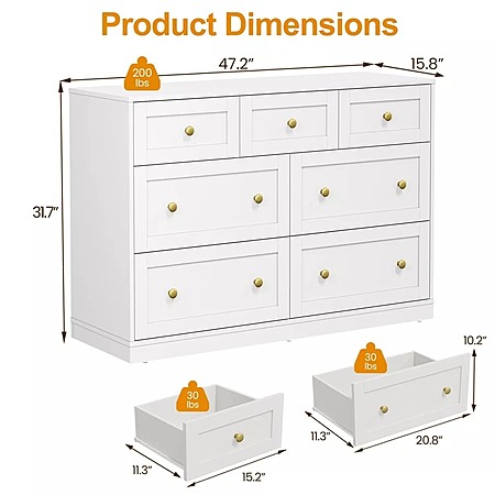 Heynemo 47" x 31.7'' 7-Drawer Modern Dresser w/ Gold Knobs (White) $138 + Free Shipping