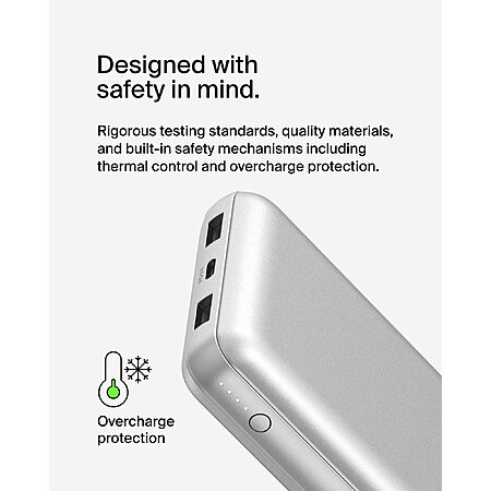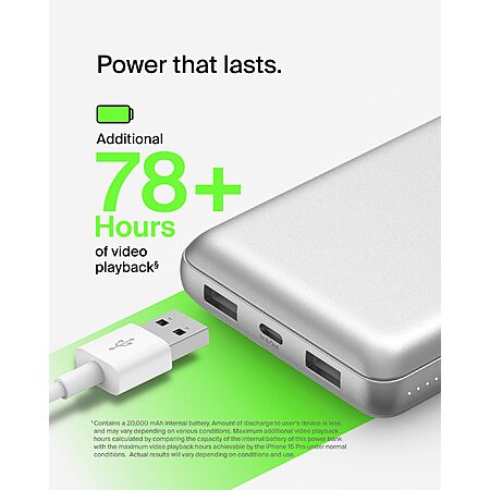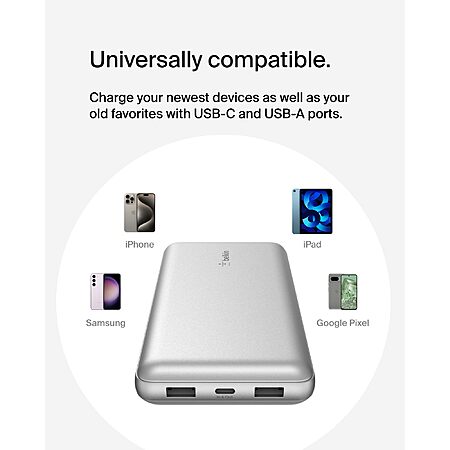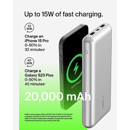 Belkin Portable Charger USB-C Power Bank 20000 mAh w/ 1xUSB-C Port & 2xUSB-A Ports, 15W w/ Type-C to Type-A Cable (Silver) $19.99 + Free Shipping w/ Prime or on $35+