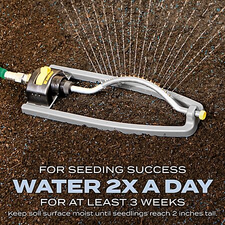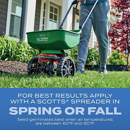 - Scotts Turf Builder Grass Seed Sun and Shade Mix thrives in a variety of conditions. This grass seed mix contains Root-Building Nutrition, a combination of ingredients that is expertly crafted to help establish deep roots to grow thick, green turf so that you can build a better, stronger lawn from the roots up. This combination grass seed, fertilizer, and soil improver is designed for full sun and dense shade, and has medium drought resistance with medium to high durability. It can be used to seed a new lawn or overseed an existing lawn. For best results, apply in the spring or fall when daily average soil temperatures are consistently between 55°F and 70°F or air temperatures are between 60°F and 80°F. We recommend using a Scotts spreader to apply this product (please refer to spreader settings on product label). Water daily or as needed to keep the soil surface moist until the seedlings reach at least 2 inches tall. One 2.4 lb. bag of Scotts Turf Builder Grass Seed Sun and Shade Mix has a new lawn coverage of 320 sq. ft. and an overseeding coverage of 960 sq. ft.