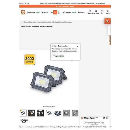 Home Depot: Defiant 3000 Lumens Rechargeable Magnetic Utility Light With Power Bank (2-Pack ) $7.50 (reg. $30) Clearance YMMV in store