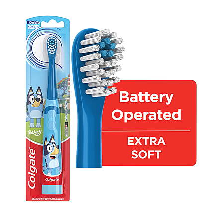 Product Description: | Colgate Kids Battery Toothbrush, Bluey Toothbrush, 1 Pack The Bluey Colgate Kids Battery Toothbrush is a kids toothbrush that provides fun toothbrushing to keep children’s teeth clean and sweep away plaque. With a vibrating brush head, this kids vibrating toothbrush cleans better than a manual toothbrush. The kids toothbrush features a small, oscillating head with extra soft bristles that are gentle on delicate gums. This vibrating toothbrush for kids is battery-powered, so it’s easy to recharge wherever you are (1 AA battery is included). Get the classic Colgate clean you can count on with the Bluey themed Colgate Kids Battery Powered Toothbrush. Kids Toothbrushes Made Especially for Kids Good oral health starts at a very young age. Designed for little hands and mouths beginning at ages 3 and up, the Colgate Kids Power Vibrating Toothbrush is a battery toothbrush for kids designed to facilitate a fun and easy toothbrushing experience that kids will enjoy. The kids battery toothbrush features a slim, easy-to-hold handle to let them do the brushing, while the vibrating brush head does all the work. This kids toothbrush also has a flat-laying handle so kids can easily apply toothpaste without the brush rolling over or away when you set it down on the counter. And its vibrating brush head is small enough to reach every corner of the mouth. Healthy Smiles With Colgate Bright Smiles, Bright Futures®: At Colgate, we’re making kids toothbrushes more fun because we know the power of a healthy smile. Our children’s oral health initiative, Bright Smiles, Bright Futures®, has impacted the lives of more than a billion children by providing free oral health education and dental care in over 80 countries. As the world leader in oral care, Colgate is committed to improving children's oral health around the world. Includes one (1) Colgate Kids Battery Toothbrush with included AA battery, Bluey Battery Toothbrush for Kids This Colgate Kids Battery Powered Toothbrush is made for children ages 3 and up A flat-laying handle makes it easy to apply toothpaste to this kids vibrating toothbrush without the brush rolling over or away This Colgate battery powered toothbrush for kids has a small, vibrating brush head with extra soft bristles that cleans teeth and sweeps away plaque The battery-operated kid toothbrush features an easily replaceable battery (1 AA battery included) and has a convenient on/off switch The extra soft bristles on this kids toothbrush gently clean teeth and gums A slim, easy-to-hold handle makes this kids toothbrush perfect for little hands to use The multi-height extra soft bristles clean big and small teeth, from baby teeth to growing adult teeth |