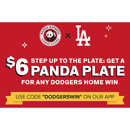 Panda Express [pandaexpress.com] is offering for Select Southern California and Nevada Locations: a Plate Meal (2 Entree + 1 Side) for $6 when you login to your Panda Rewards Account (free to join [pandaexpress.com]) and apply coupon code DODGERSWIN in your cart. Select store pickup where available to avoid delivery fees.