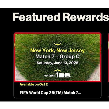 Experience the ultimate sporting event - FIFA World Cup 26T™. As a Verizon customer, enjoy exclusive access to this once-in-a-lifetime experience. Get two (2) tickets to match 7 in New York/New Jersey on 6/13/2026. Immerse yourself in the electrifying atmosphere of live world-class soccer. Don't miss this opportunity to witness history unfold!