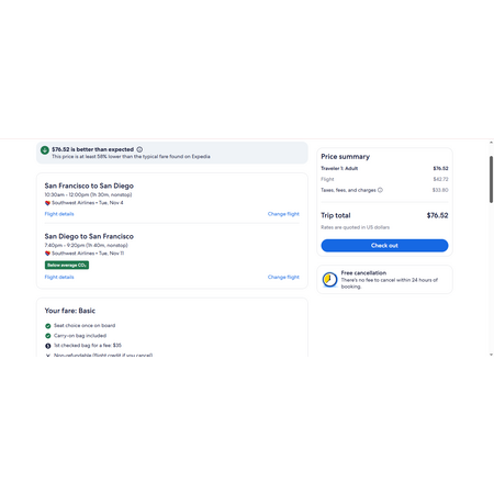 Southwest Airlines, United Airlines and Expedia have round trip airfares travelling to and from San Diego (SAN) and San Francisco (SFO) for $77, nonstop. These are basic economy fares. On United you may have a personal item. On Southwest you may have a personal item and a carry-on bag. If you are travelling with children on United, you will be seated together as per UA's policy.