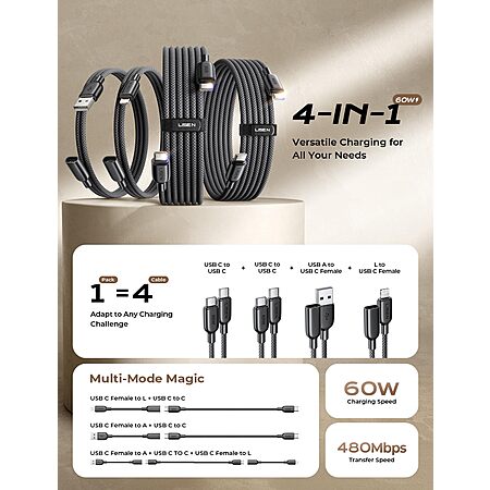 2-Pack 6.6' LISEN 60W USB-C Cables + 2-Piece 1.3' USB-C to USB-A / Lightning Adapters on sale for $13.99