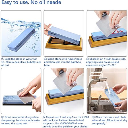 【Complete Knife Sharpening Stone Kit】You don't need to be a Pro to sharpen your blades, all you need is the right tools & technique. All the sharpening tools you need are here, one affordable set for you: 400/1000 & 3000/8000 grit whetstone; Coarse flattening stone; Non-Slip Bamboo base; Knife sharpening angle guide; Leather strop, a simple instruction manual about how to use and what does every component do.