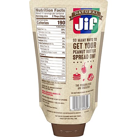 10-Pack 13-Ounce Jif Natural Squeeze Creamy Peanut Butter $24.29 ($2.43 Each) w/ S&S + Free Shipping w/ Prime or on $35+