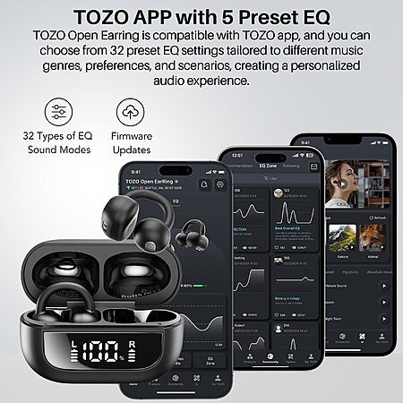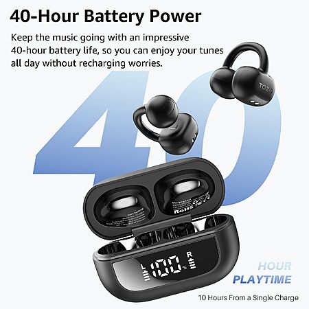TOZO OpenEarRing True Open Ear Headphones, Lightweight Comfort Open Ear Clip Wireless Earbuds, 40H Play Bluetooth 5.4 Headphones with Smart Digital Display $24.98