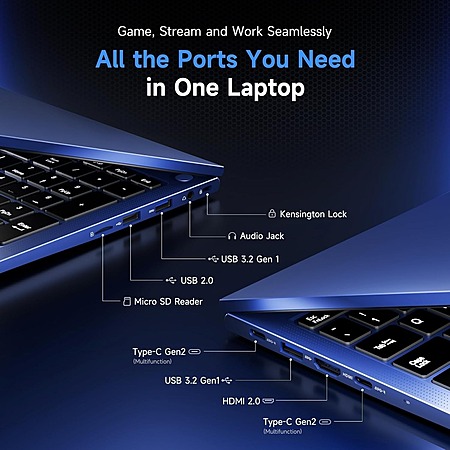 • Ports:2x USB-A 3.2,1 x USB-A 2.0,2x USB-C (Multifunction),1x HDMI2.1 TMDS,1x Headphone / microphone combo jack (3.5mm),1xMicroSD card reader,1 x Kensington lock