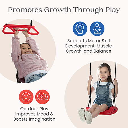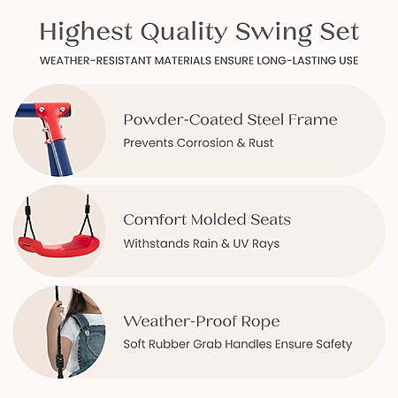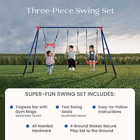 Take playtime to new heights with the FunZone Outdoor Metal 3-Piece Swing Set by Delta Children! Kids can soar on two swing seats or a trapeze bar with gym rings, enjoying endless outdoor fun that helps reduce stress and anxiety, improves mood, boosts creativity and imagination, and enhances attention span and focus. And that's not all, this swing set will help promote gross motor skill development by pumping legs, running and jumping, and fine motor skill development with grip strength, hand, arm and finger coordination. The rope attachments are adjustable to ensure a perfect fit for all ages and heights. Built from premium, child-safe materials, this A-frame swing set includes all hardware and ground stakes—no extra purchases needed! The two-inch heavy duty, weather-resistant frame is powder-coated to prevent corrosion, rust and weathering, while the legs include foam padding for added safety, and the molded plastic swings and rope attachments are resistant to weather conditions such as rain and UV rays. Each element supports up to 100 pounds (300 pounds total), making it the perfect addition to any backyard!