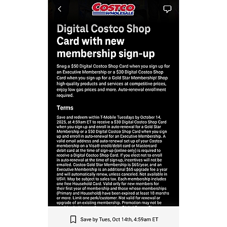 Costco Wholesale: Take shopping to a new level. Digital Costco Shop Card with new membership sign-up. Snag a $50 Digital Costco Shop Card when you sign up for an Executive Membership or a $30 Digital Costco Shop Card when you sign up for a Gold Star Membership!