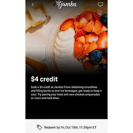 Jamba: Score a refreshing treat. Grab a $4 credit at Jamba!