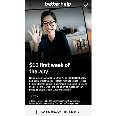BetterHelp: Help nourish your wellbeing. $10 first week of therapy. With new BetterHelp membership sign-up. See terms.