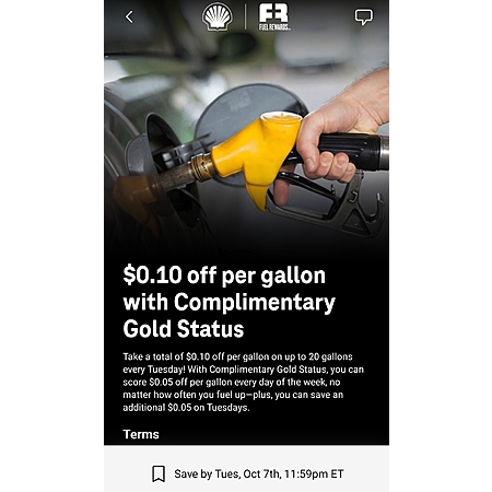 Shell/Fuel Rewards: Take $.10 off per gallon with complimentary Gold Status