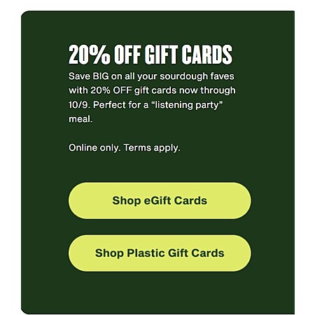 Panera Gift Cards 20% Off through 10/9 Online Only