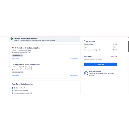 American and Expedia have round trip airfares travelling to and from West Palm Beach FL (PBI) and Los Angeles (LAX) for $193, making 1 stop both ways. These are basic economy fares. On American, you may have a personal item and a carry on bag. There is no seat selection and no change. If you are travelling with children, you will be seated together as per AA's policy.