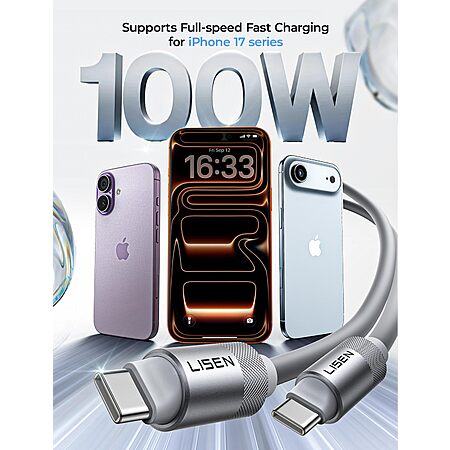 LISEN 10' 100W Silicone USB C to USB C Fast Charging Cable $6 + Free Shipping w/ Prime or on $35+ orders