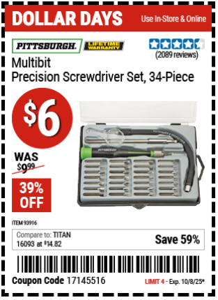 Harbor Freight [harborfreight.com] is selling the PITTSBURGH Multibit Precision Screwdriver Set, 34-Piece for $6 with coupon code 17145516. Alternatively, snag the coupon that should be attached to this post.