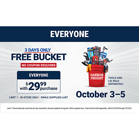 Harbor Freight offers a coupon for a free five gallon bucket with $29.99 purchase. ITC members receive the bucket free with ANY purchase, valid October 3 - 5.