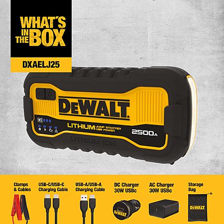 - The DEWALT DXAELJ25 is a portable and powerful jump starter and USB power bank in a small take-along size. 2500 peak Amps of starting power instantly jump starts cars and trucks up to 8-cylinders. Powder-coated metal clamps are included. The reverse polarity protection assures that jumper cables are connected correctly. The powerpack features 60-Watt PD In/Out USB Type C, 25-Watt USB Type C-PD and 15-Watt USB Type - A ports. It also has an AC output of up to 30-Watt max and a DC output of 30-Watt. The bright LED light helps with repairs after dark. 1-year warranty.