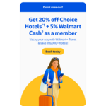 Walmart+ members may book travel through their Walmart+ Travel site, powered by Expedia. Through the end of October, use the code below to book a stay at participating Choice Hotels and save 20% plus 5% back in Walmart Cash.