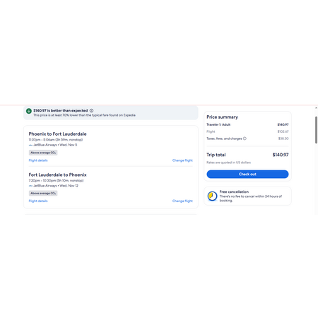 JetBlue and Expedia have round trip airfares travelling to and from Phoenix (PHX) and Ft Lauderdale (FLL) for $141, nonstop. These are basic economy fares that allow a personal item and a carry-on bag. There is no seat selection and no change. If you are travelling with children, you will be seated together.