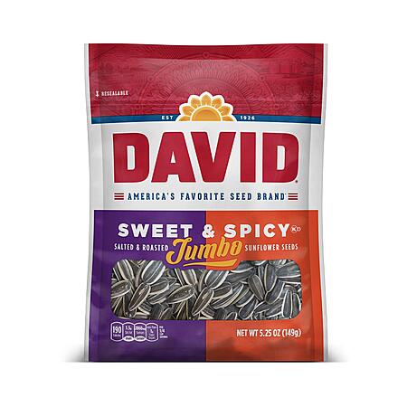5.25-Ounce DAVID Roasted and Salted Sweet and Spicy Jumbo Sunflower Seeds for $2.26 - 15% Off when you 'clip' the coupon on product page - 5% Off when you checkout via Subscribe & Save =