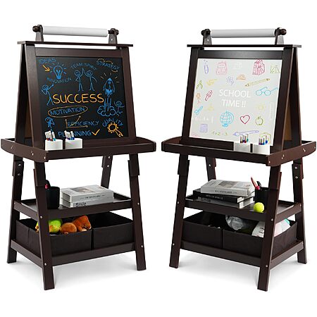 Art Easel for Kids, 3 in 1 Adjustable Wooden Kids Drawing Easel, Double-Sided Whiteboard, Chalkboard & Paper Roll, 2-Tier Rack with 2 Storage Boxes $49.99