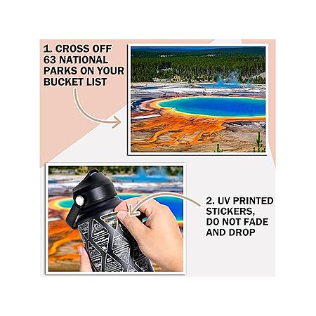 - Track Your Adventures: Features designs of 63 U.S. National Parks, paired with 2*63 waterproof matching stickers. Each time you visit a park, add a sticker to your insulated bottle for a fun and interactive bucket list experience.