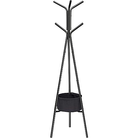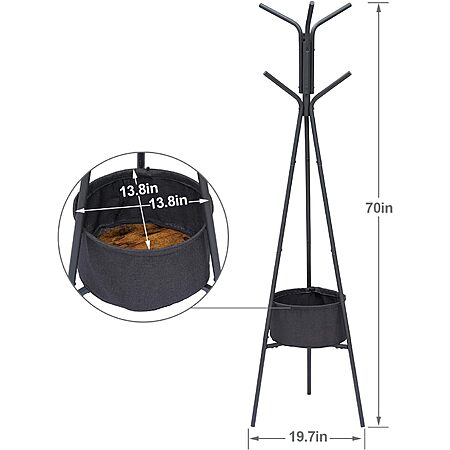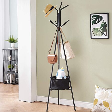 $16.99:VECELO Freestanding Coat Rack with 6 Hooks, Shelf & Storage Basket – Rustic Brown/Black