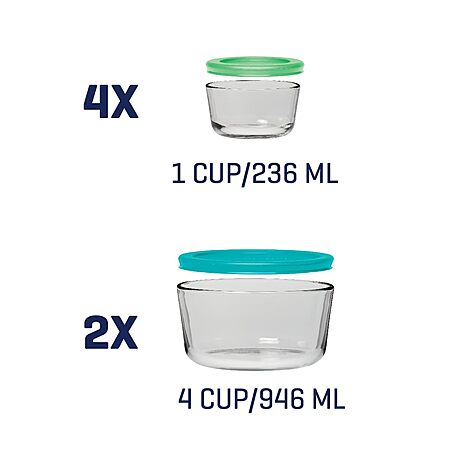 - INCLUDES: This Anchor Hocking glass storage set contains (4) 1-cup containers and (2) 4-cup containers with navy lids. Unlike most plastics and metals, glass is all-recyclable, won't stain, and won't retain odors. Enjoy a cleaner experience.